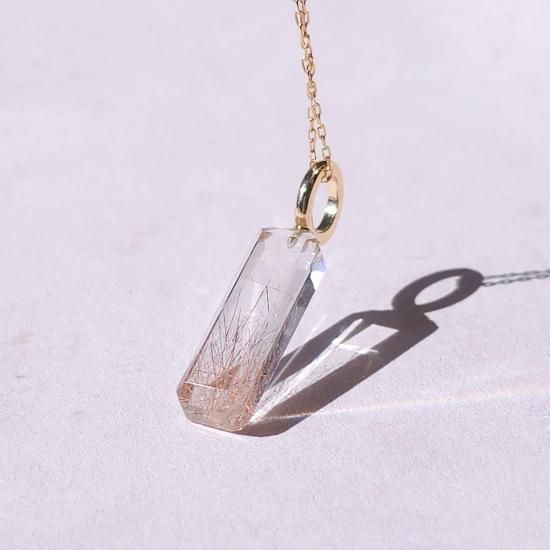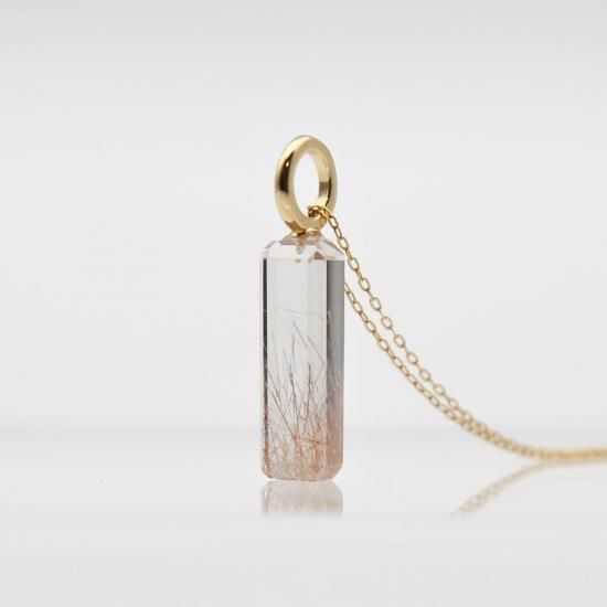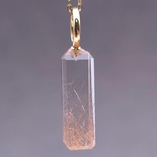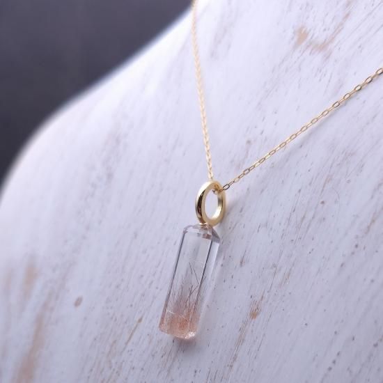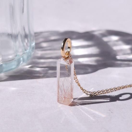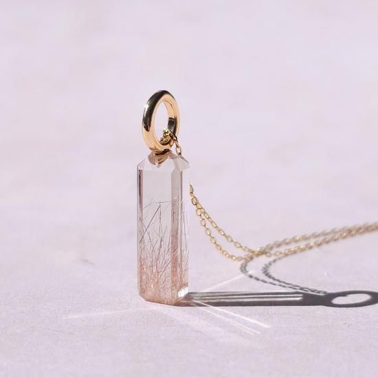 クリアな水晶の中に、グラデーションを描くようにピンクルチルを内包するレアストーン。光を受けると内部のルチルがキラキラと輝き、胸元を上品に彩ります。