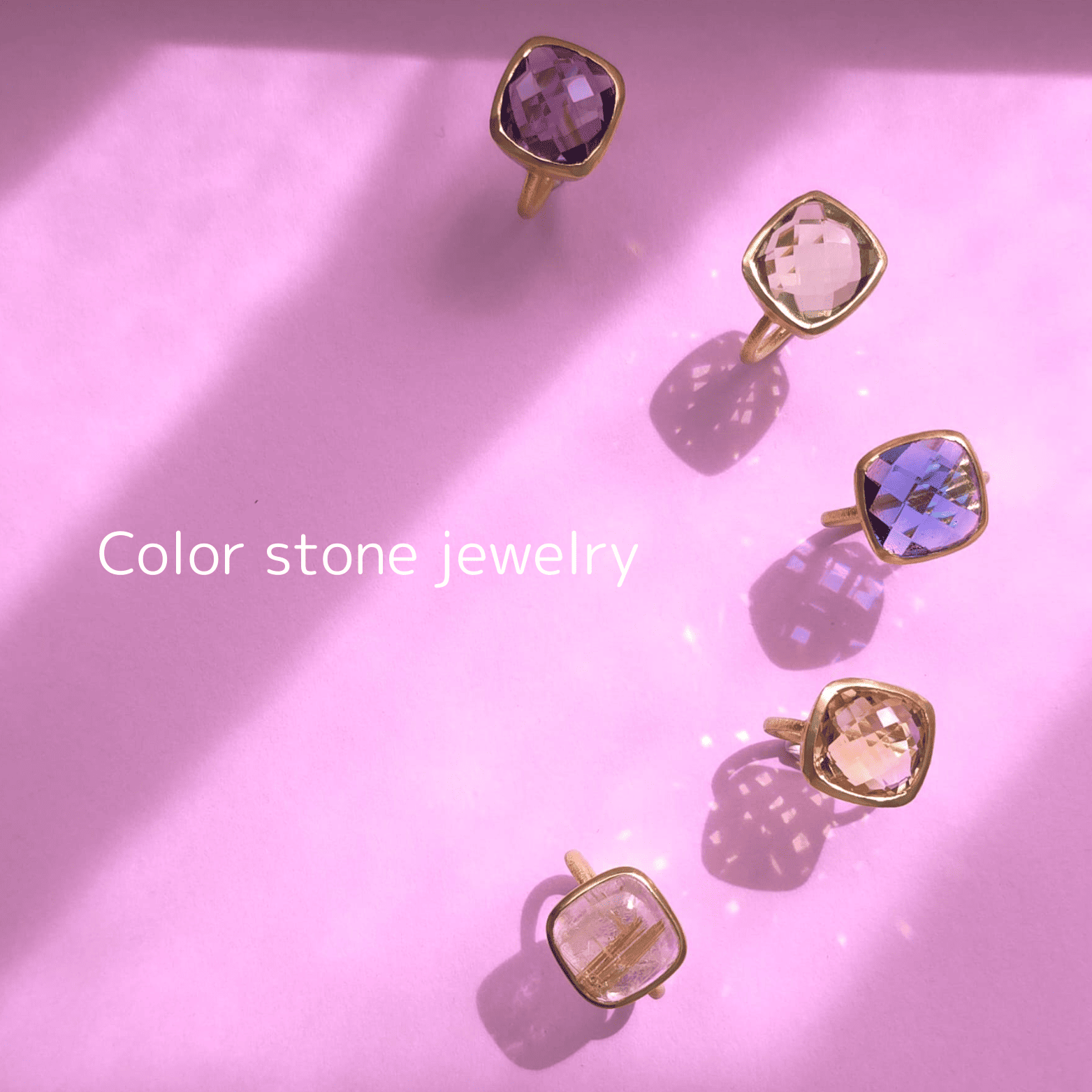 大粒にこだわった理由は、天然石やカラーストーンの持つ美しさをより感じていただけること、そして指にはめた時、手元で色とりどりに輝くリングの存在感が心のよりどころとなるよう願って、粒の大きいカラーストーンを選定しています。